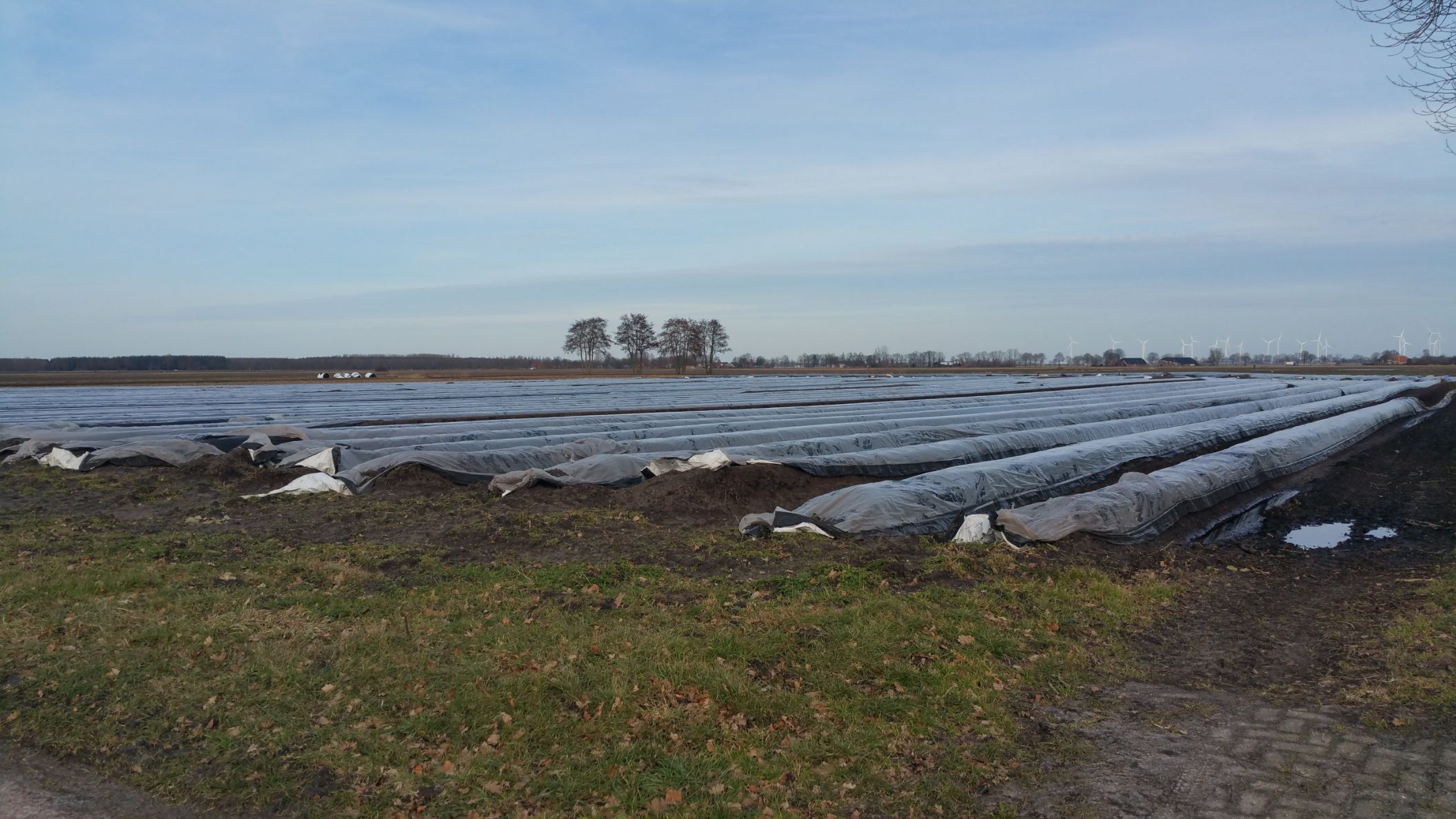 De aspergeruggen zijn al opgebouwd en het zwart/wit folie erover heen gelegd.